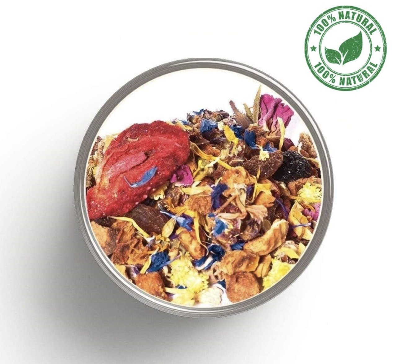 Pomme, datte (datte, farine de riz), figue (figue, farine de riz), coing, raisin (raisin, huile végétale), écorces d’orange, pomme, arôme naturel, arôme naturel d’orange, grenade, cardamome, baie de goji, fraise, aronia, lavande, souci, mauve, pétales de rose, fleurs de sureau, fleurs d’immortelle, fleurs de bleuet. Mélange premium avec des ingrédients issus de l’agriculture durable et des arômes naturels